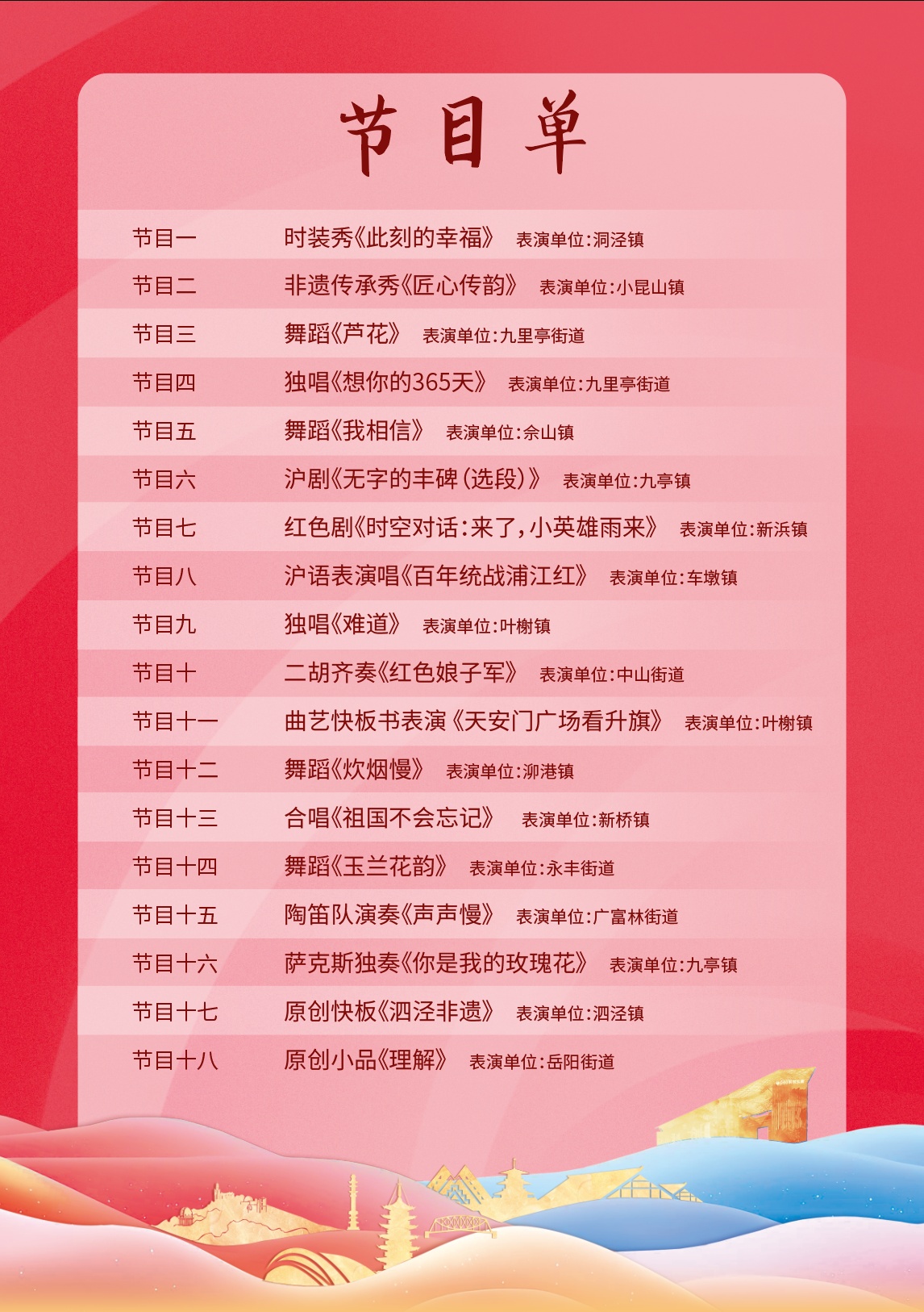 复赛将邀请四位评委现场打分,两场比赛全部结束后综合评定奖项。本次比赛设一等奖2个、二等奖6个、三等奖12个,其余参赛节目均获优胜奖。获奖名单将于12月底在“上海松江”微信公众号上公布,获奖节目更有机会登上2026年松江区社区春晚的最终舞台。届时,松江区社区春晚复赛盛况将在“上海松江”客户端全程直播,敬请关注!