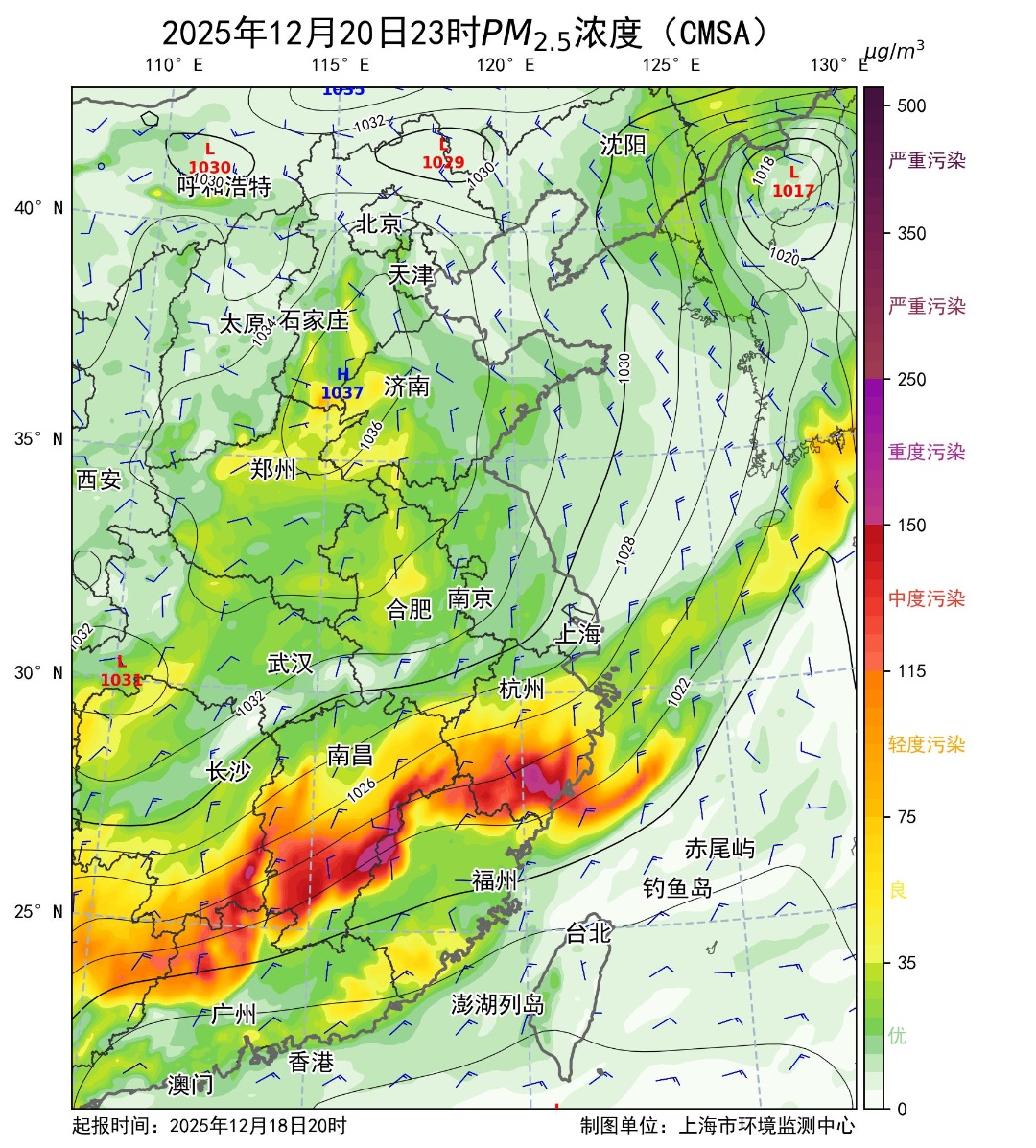 20日4时、16时、23时PM2.5浓度预报图