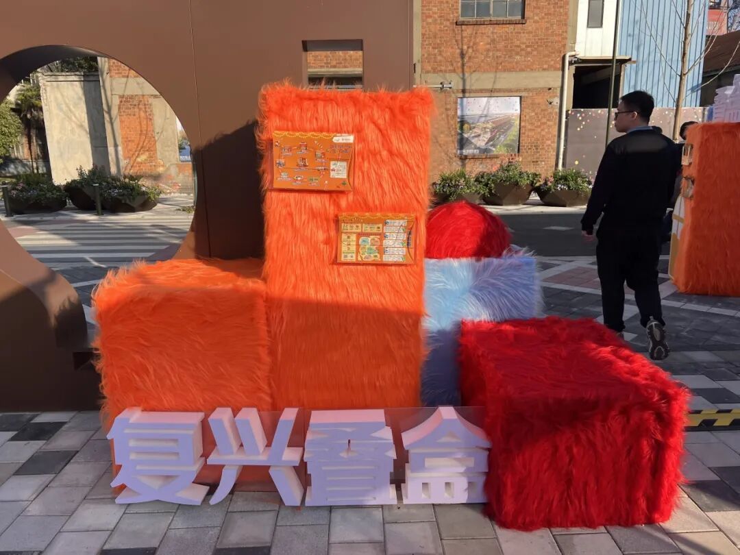 下午3点,步入复兴岛船台公园,银河东街方向不时传来阵阵歌声。走近一看,一片以亮橘色为主调的文化市集跃然眼前,数个毛茸茸的立体模块错落叠放、自由组合,仿佛在欢迎市民游客的到来。