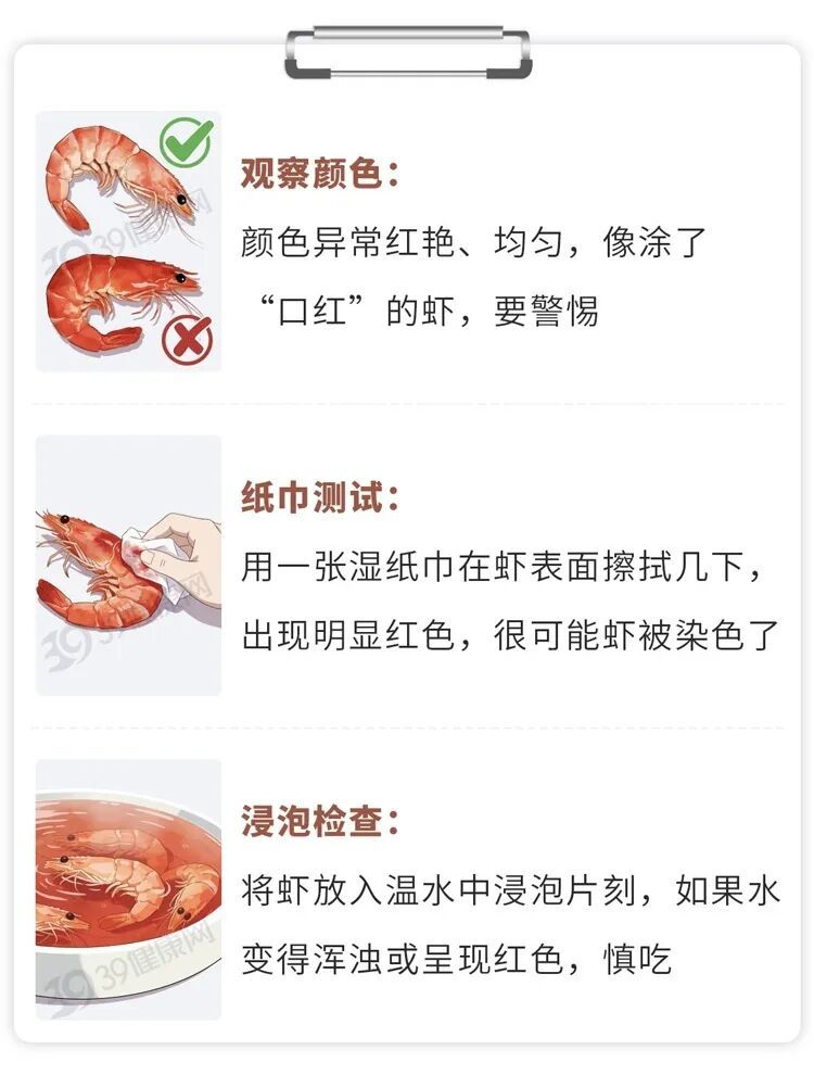 新鲜的虾应呈自然的青灰色或淡粉色。如果你看到的虾通体鲜红、油光发亮,像化了妆一样,就要高度警惕了。一些不法商贩会用胭脂红等人工合成色素给不新鲜甚至变质的虾进行染色处理,以次充好。