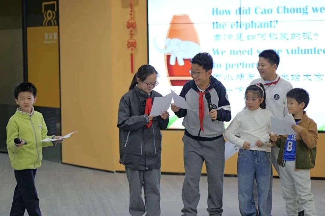 近日,徐汇区凌云街道社工站内,一场以“曹冲称象”为灵感的双语戏剧工作坊热烈展开。40名中小学生在专业戏剧老师的带领下,不仅用英语全新演绎这一古老故事,更完成了一场从历史智慧到当代责任的生动穿越。