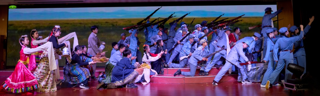 九十年前那段波澜壮阔的征程,在一个多小时的演绎中穿透历史,直抵人心。台上,学生们身着亲手缝制的红军装与藏族服饰,眼中有光;台下,合唱队与管弦乐队默契无间,乐声流淌;剧场后方的总控室里,6名学生全神贯注,随着剧情精准调度着灯光、音效与每一帧转场动画。