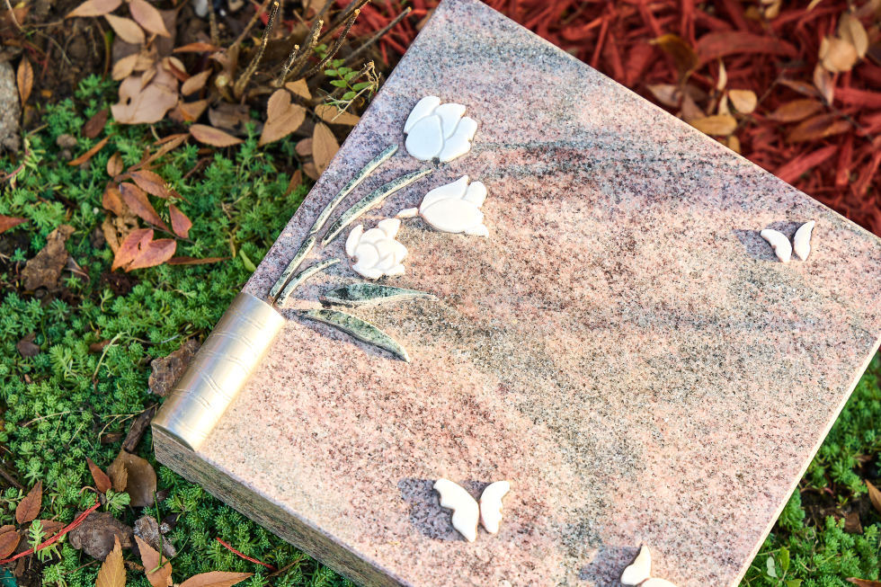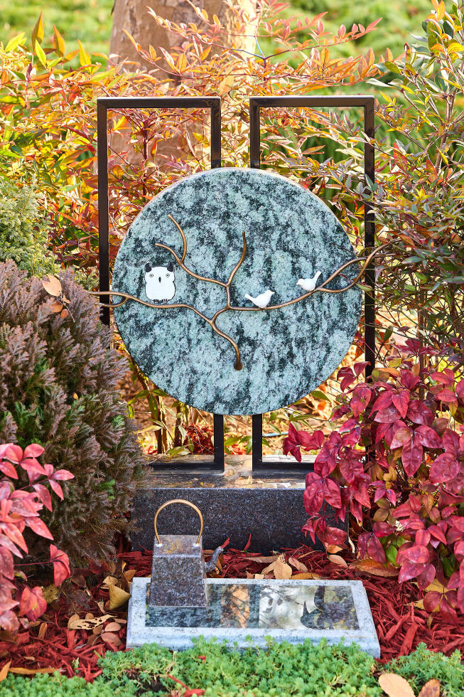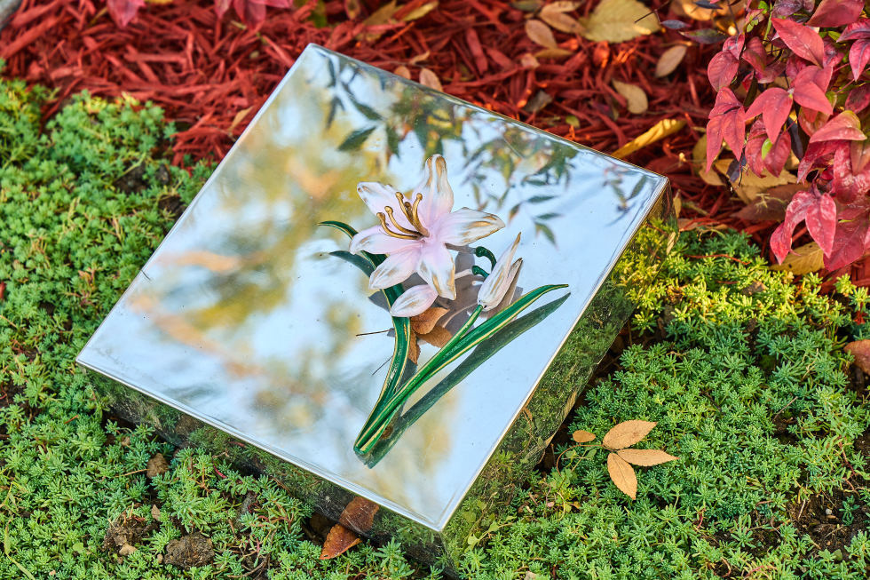 在“科技殡葬”维度,展品深度融合数字化表达。如《绝美画卷》预留二维码集成信息载体,《蝶舞》采用镜面反射营造虚实相生的互动体验,拓展了纪念的时空边界。与此同时,“智‘惠’殡葬”理念贯穿于服务环节,园区提供数字追思、云纪念等普惠服务,让技术真正服务于情感连结。