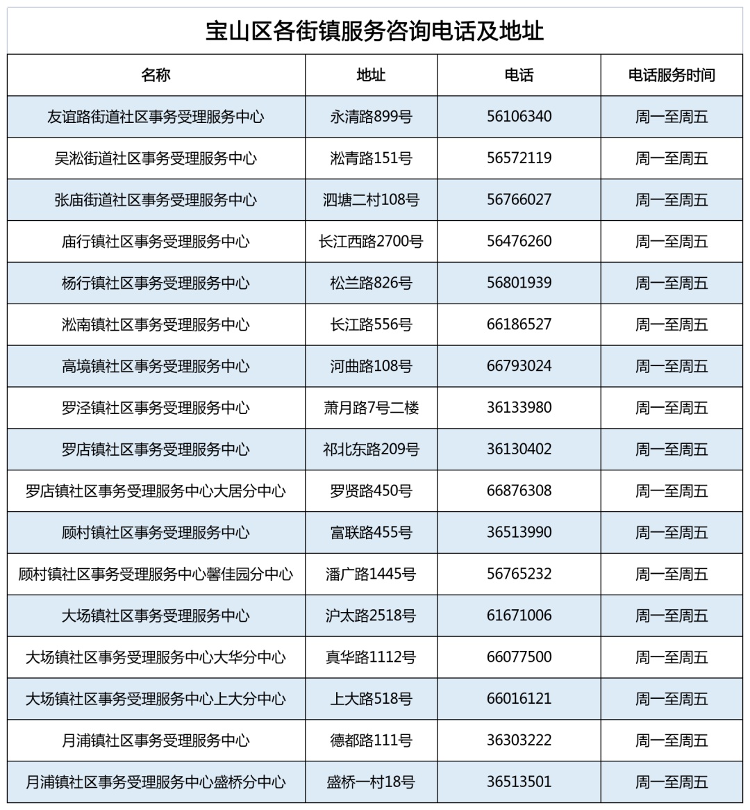 为方便大家就近办理医保业务,现将宝山区各街镇最新医保服务网点信息公布如下:
