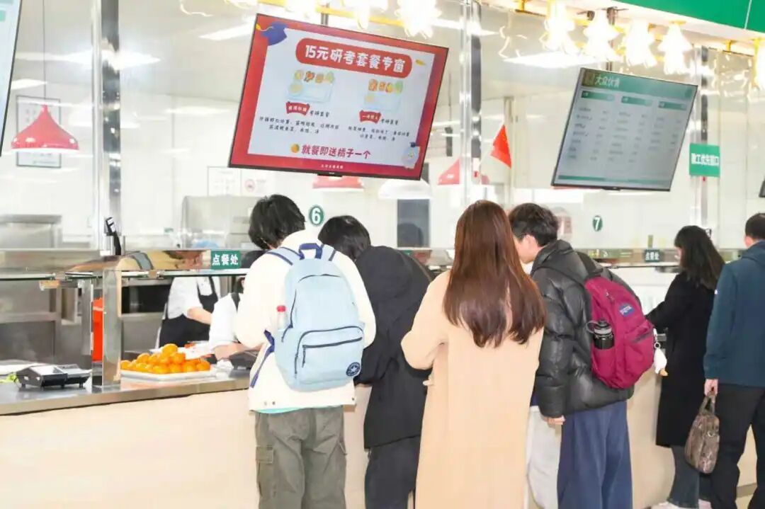 上海电力大学开放大礼堂作为考生午间休息区域,并在食堂布置励志环境。食堂推出“考研加油餐”,同时供应红糖姜枣茶与热水,助力学子安心冲刺。