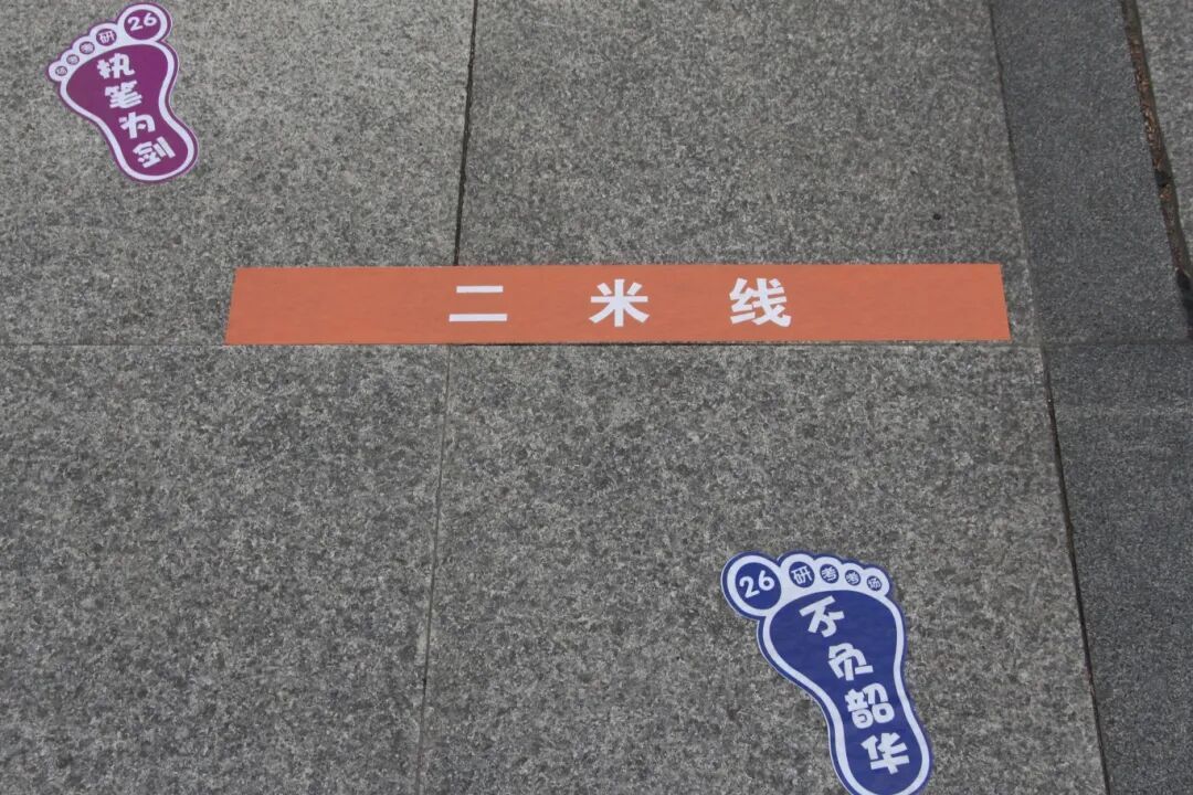 上海政法学院为考生准备了暖身的饮品,还在引导考生有序入场的地贴上,印上祝福语,给予考生鼓励和关爱。