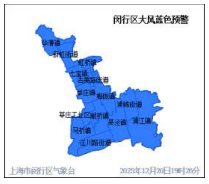 上海市闵行区气象台2025年12月20日19时26分发布大风蓝色预警信号: