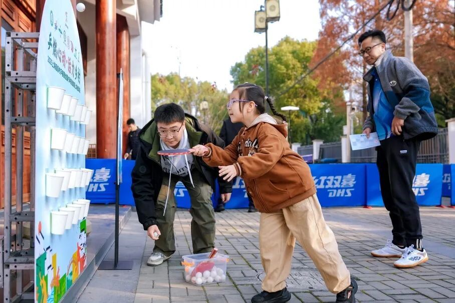 赛场之外,农民文体活动同样丰富多彩。农民体育传统项目展演率先暖场,《挑花篮》《幸福莲湘舞起来》节目以优美的舞姿和鲜明的节奏,展现了乡土文化的独特魅力与传承创新。青浦地产优质农产品与乡村非遗集中亮相,十余个特色摊位吸引了众多村民和游客驻足,实现了体育赛事与乡村经济的良性互动,让乡村盛会更具烟火气与实用性。六大乒乓球趣味互动游戏区成为人气聚集地,“智能乒乓球双人打榜赛”“一乒到底”等创新游戏让不同年龄段的参与者沉浸其中,在娱乐中感受国球魅力。