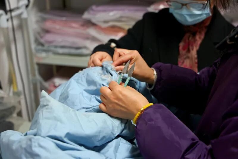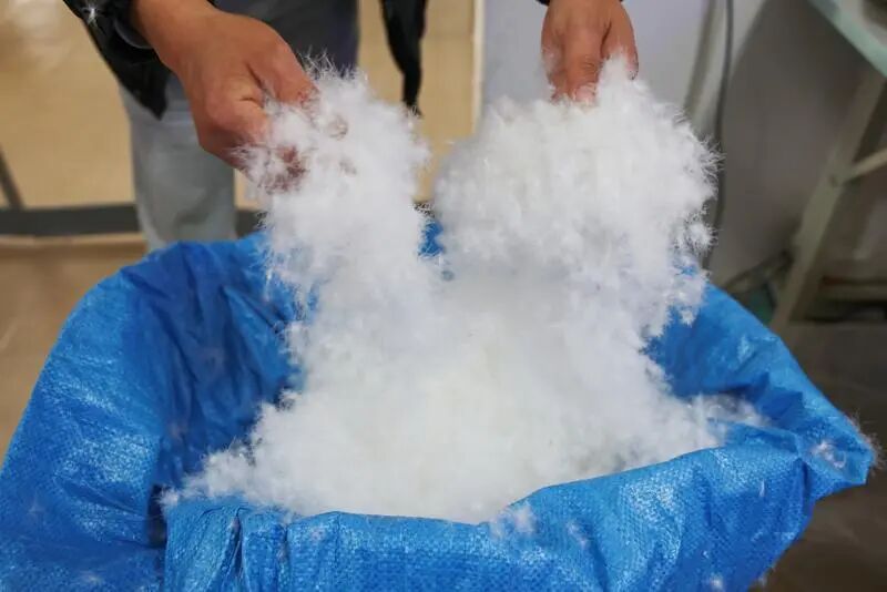 据了解,羽绒翻新的规格可灵活选择,一般七八件旧羽绒服就可以制作一条冬被,春秋被5到6件就足够。“先把旧衣服的绒全部拆取出来,经过过滤、消毒,筛掉结块、变质的劣质绒,再将处理好的优质绒充进新被套,全程透明可见,大约两小时就可以取被。”王春英一边拆解检查羽绒,一边介绍。