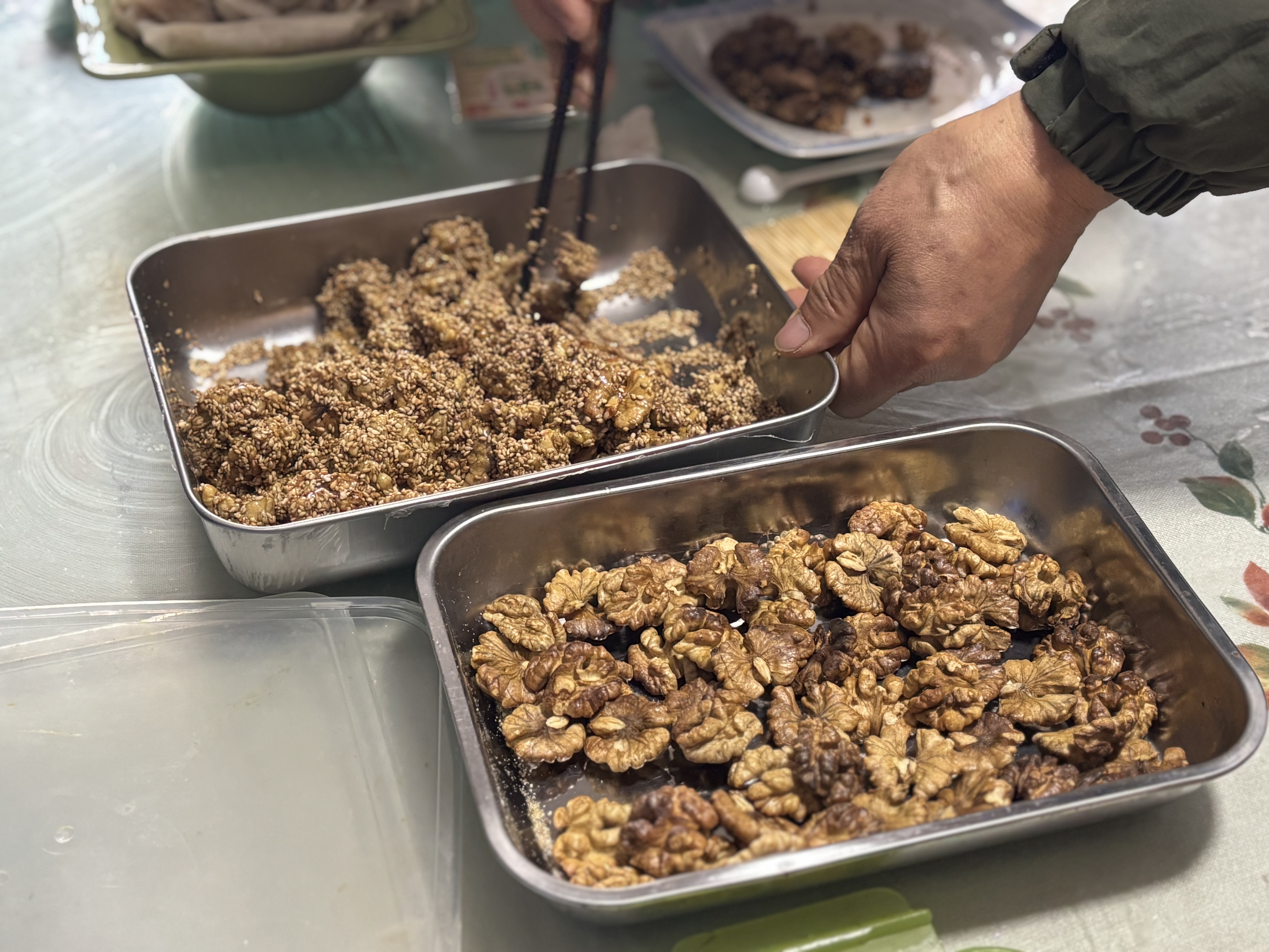 记者尝了一口徐德富此前制作的酒酿,质地绵密、入口即化、甜而不腻,酒香也十分浓郁。除酒酿之外,徐德富还特地制作了琥珀核桃作为饭后甜点。他先是清洗生核桃,然后放入空气炸锅均匀烤制3分钟,取出来翻面后再烤制3分钟。最后裹上芝麻和新鲜炒制的蜂蜜即可。“我们今年除了猪蹄、春卷、泡菜这老三样,还整了一点创新,营养又干净,几个老伙伴吃着都蛮开心的。”徐德富告诉记者。