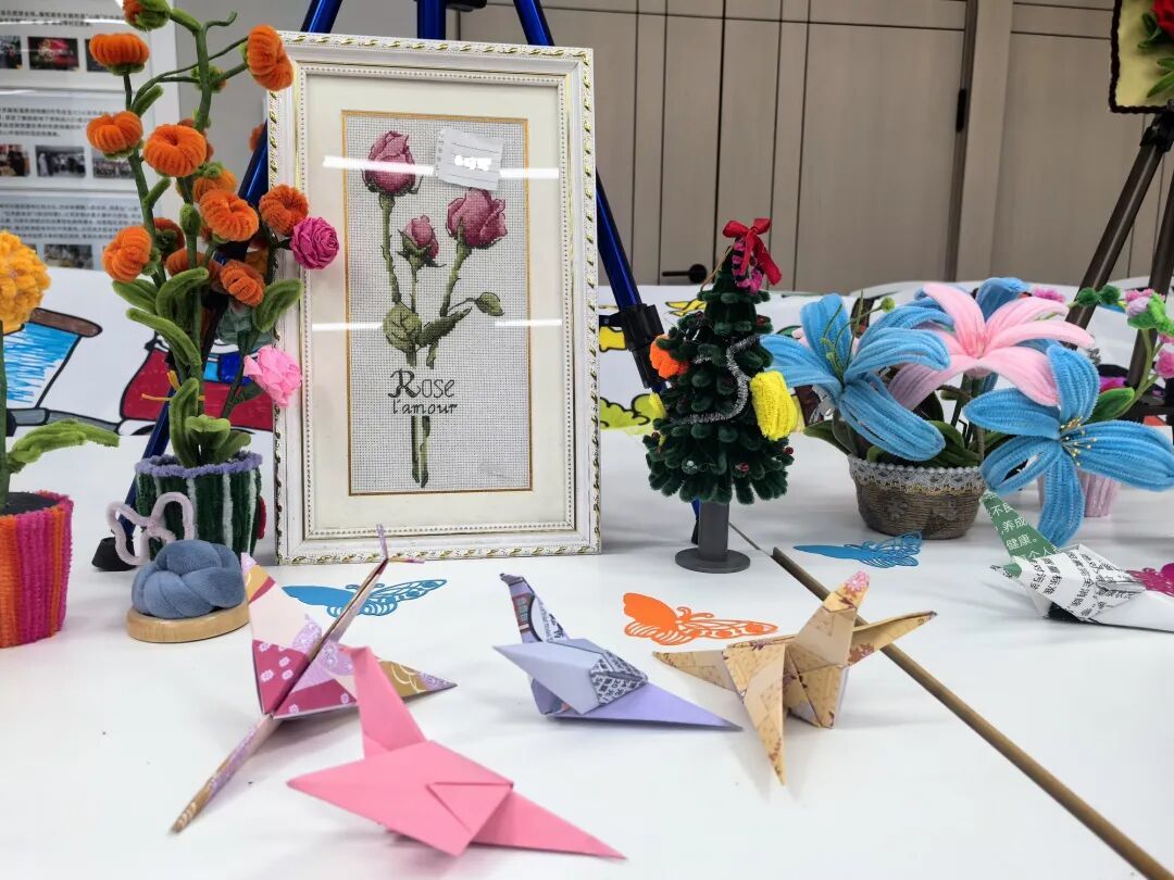现场布置充满艺术气息。墙上挂着色彩独特的画作,长桌上陈列着盘扣、扭扭棒花束等手工艺品,这些都是伙伴们在全年活动中亲手创作的。他们曾在“艺心绽放·疗愈花园”系列活动中通过音乐、舞动、戏剧表达情感;在“彩虹工坊”学习制作简单餐食和手工艺品。