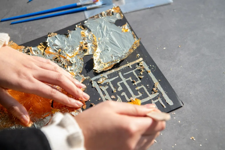 接下来需要屏息凝神,用工具轻轻夹起那薄如蝉翼、轻若烟尘的金箔,将它妥帖地覆于胶上。