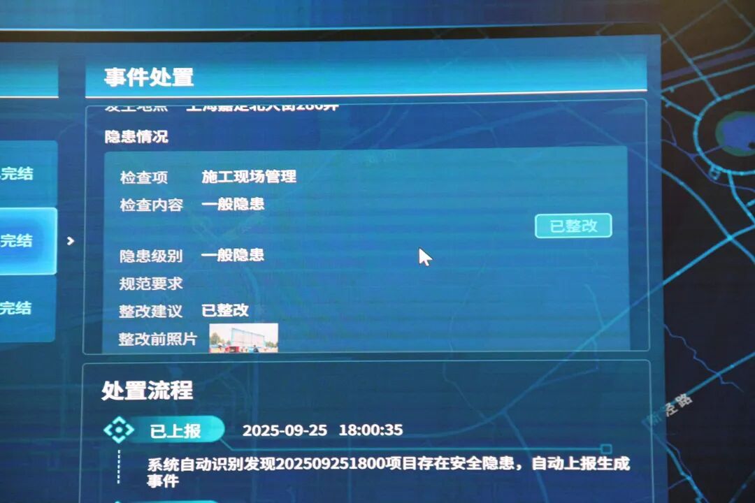 菊园新区城运中心主任钱盈向记者介绍,“菊安通”数字化应急综合管理系统具有完整数据库,工地隐患处置的完整记录——包括AI识别结果、整改建议书、联动处置过程、复查报告等,将实时同步至“菊安通”平台及城运中心大屏,实现全流程可视化追溯。每一条检查信息自动留存归档,为后续安全管理提供数据支撑,也为责任认定提供可靠依据,从而实现“安全管理有迹可循、责任落实有据可查”。