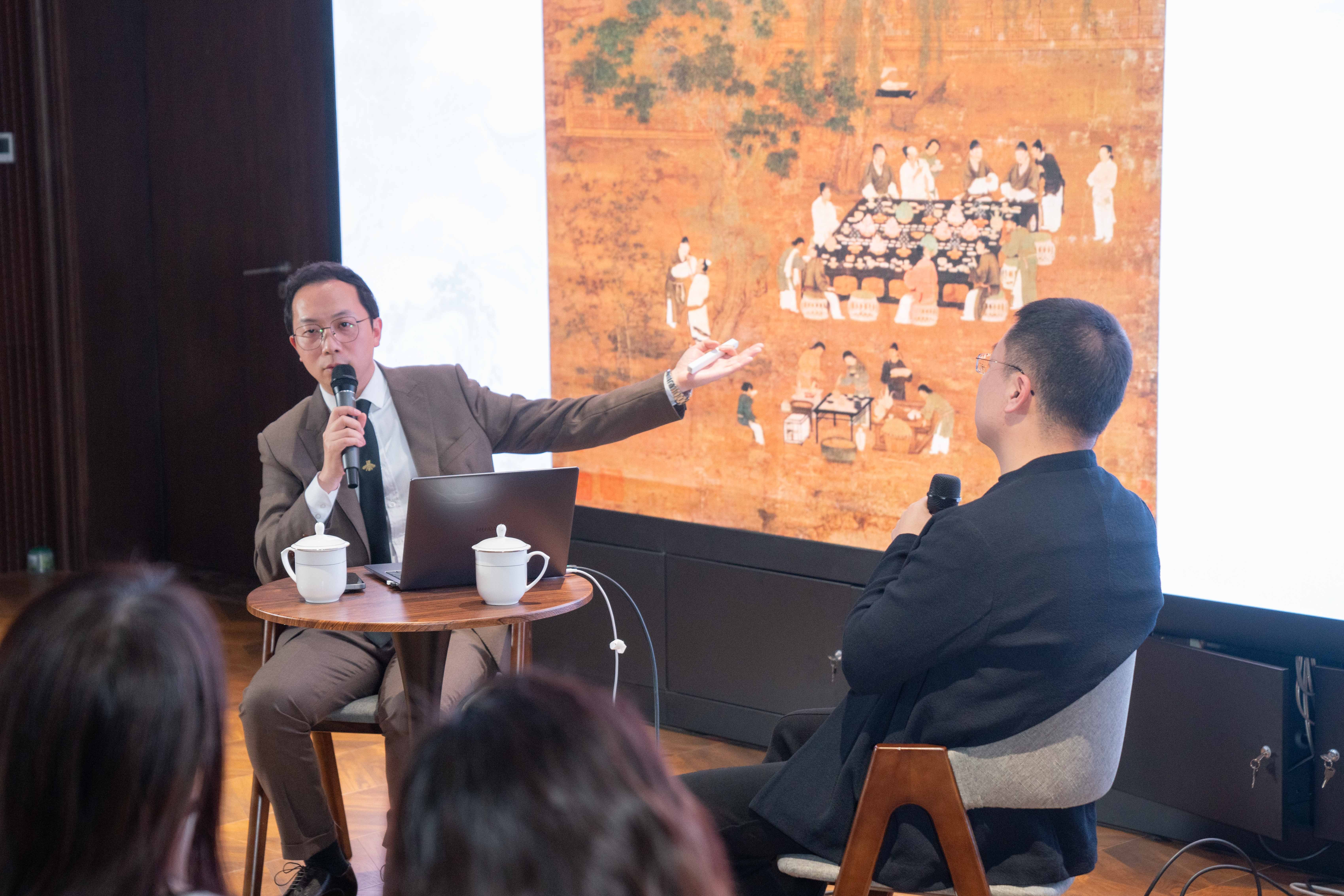 活动现场,两位嘉宾系统地梳理了文人雅集的发展脉络。从源起于东晋的“兰亭雅集”,到宋代文人雅聚典范“西园雅集”,再到明代吴门画派与清初石涛笔下的雅集风貌,两位嘉宾以“脱口秀”式的生动讲述,配合大量高清画作与文献,为观众展开了一幅幅风雅交融的人文画卷。同时,为大家解读古代文人如何通过诗画唱和、琴酒相倾构筑起精神相通的“朋友圈”,在艺术中完成心灵的对话与共鸣。