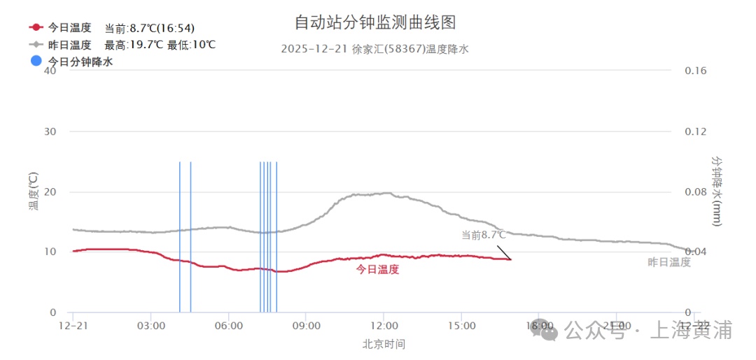 今日冷空气应景而来。昨夜今晨本市飘起秋雨,小雨量级,白天雨水渐止,但云层浓厚,阳光虚弱无力。白天各区最高气温都被压制在9~10℃,市区徐家汇站9.5℃,与昨日相差10度,体感穿越两季。上午风力较强,下午减弱,本市大风蓝色预警已于今日15时20分解除。