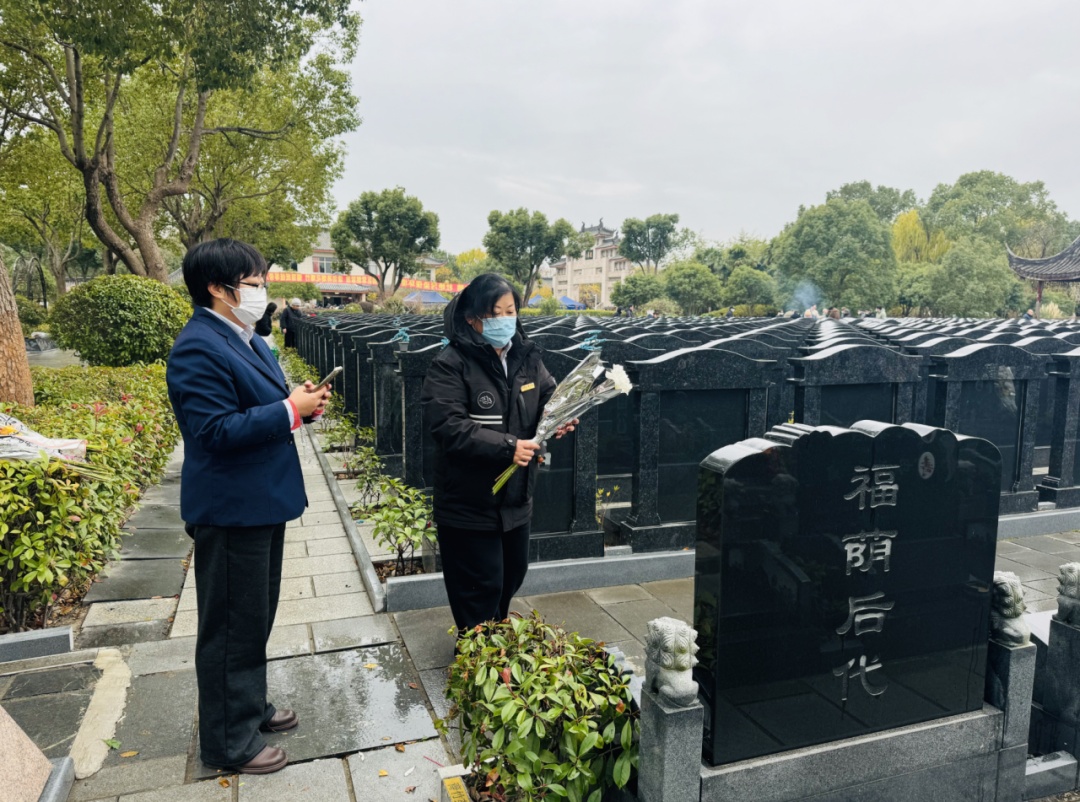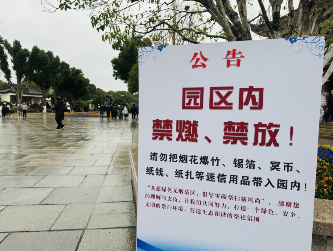 与此同时,枫泾公墓也迎来人流高峰。公墓入口处设立了分流通道和专区停车区域,现场还设置了“鞭炮换鲜花”服务点与“锡箔暂存处”,大力倡导“无烟祭扫”。