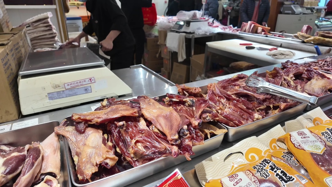 二楼的腌腊柜台前,产品琳琅满目,手工香肠、咸肉、酱油肉、风鸭腿等整齐地摆放着,散发着诱人的香气。市民们左顾右盼,仔细挑选着心仪的商品,一边琢磨着买些什么,一边已经在脑海中构思起了烹饪方法。一位正在挑选咸肉的张阿姨笑着说:“都说冬至大如年,这餐桌上肯定得有几道大菜。这咸肉用来烧腌笃鲜或者做咸肉菜饭,味道那叫一个绝,家里人都爱吃。”据工作人员介绍,像用来烧腌笃鲜或者做咸肉菜饭的咸肉,每天能卖到350斤左右;既可以清蒸又能入菜的手工香肠,每天销量也有两三百斤。