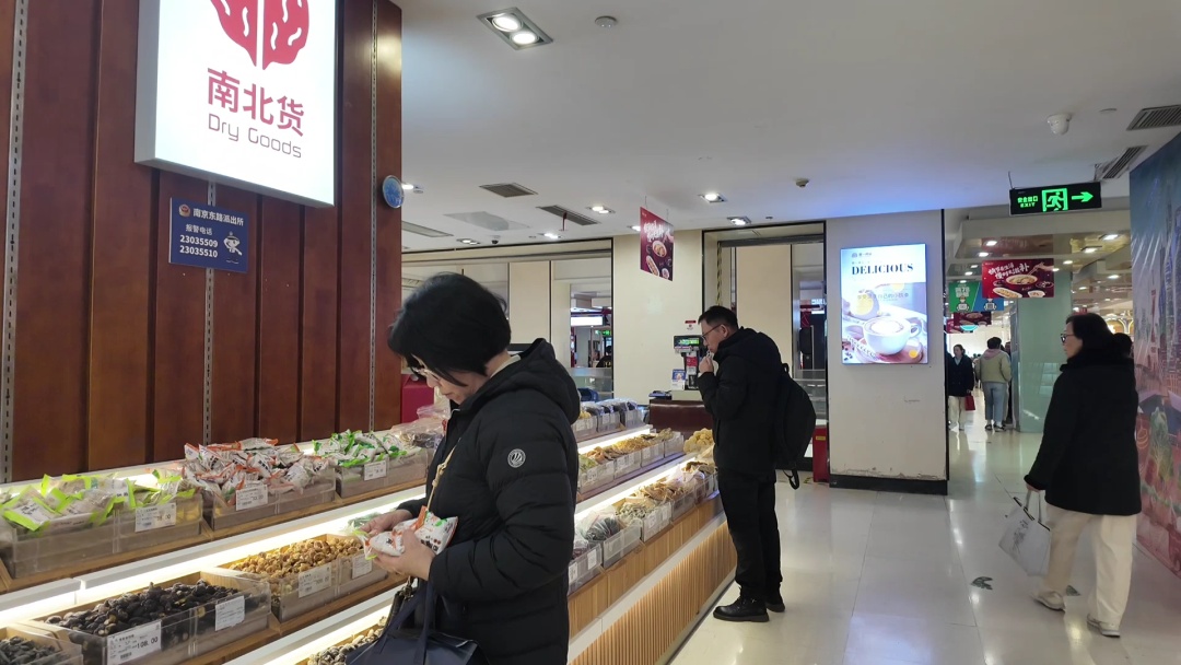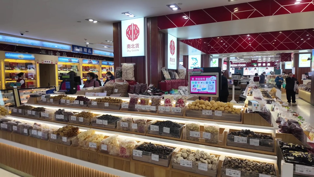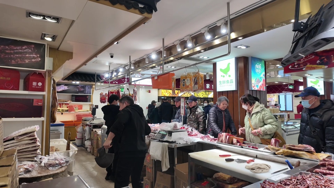 走进南京路食品商店,仿佛置身于一个热闹的采购盛会。几乎每个摊位前都围满了忙着选购的市民,他们有的手提大包小包,有的推着装满商品的小推车,在各个摊位间穿梭,一个个都收获满满。