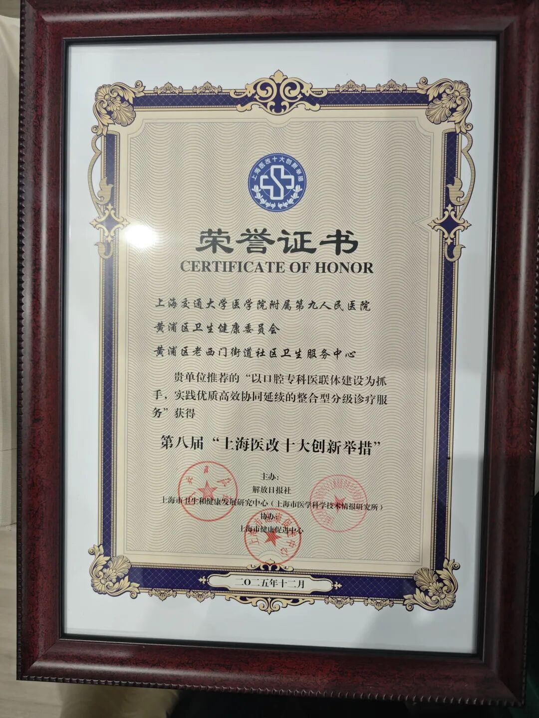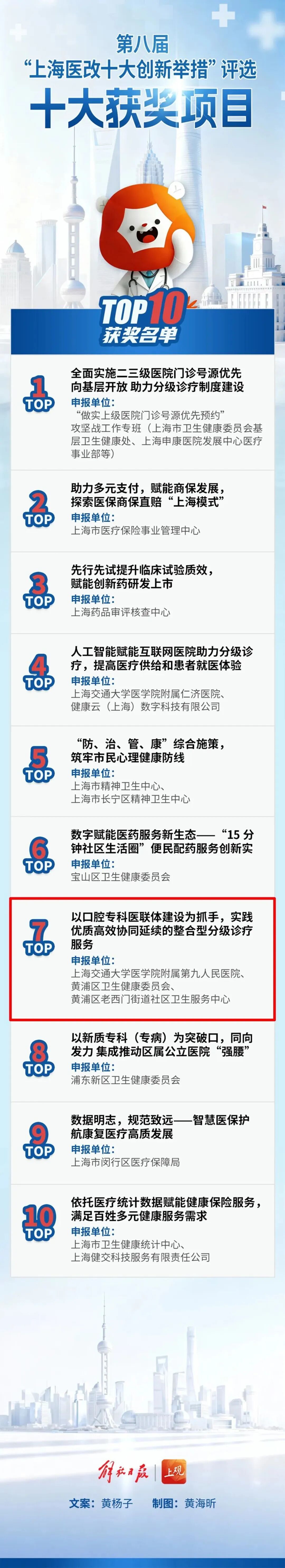 由上海交通大学医学院附属第九人民医院、黄浦区卫生健康委员会、黄浦区老西门街道社区卫生服务中心联合申报的“以口腔专科医联体建设为抓手,实践优质高效协同延续的整合型分级诊疗服务”,从全市122家单位申报的142条创新举措中脱颖而出,最终获评本届“上海医改十大创新举措”。