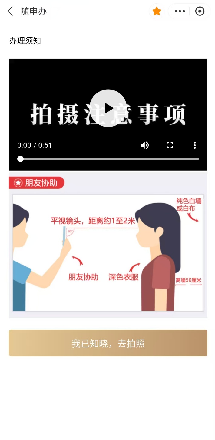 ②以“本人办理”为例,按照要求和提示拍照上传申请人本人的人像信息,在线采集照片。