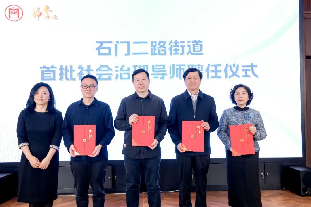 聘任仪式上,石门二路街道为中国社会治理研究会理事、上海市社会工作研究会副会长闫加伟,众蚁社区创始人、上海青年业委会联谊会秘书长韩冰,上海房产经济学会静安分会会长朱明,嘉发大厦业委会主任邱瑜颁发聘书。
