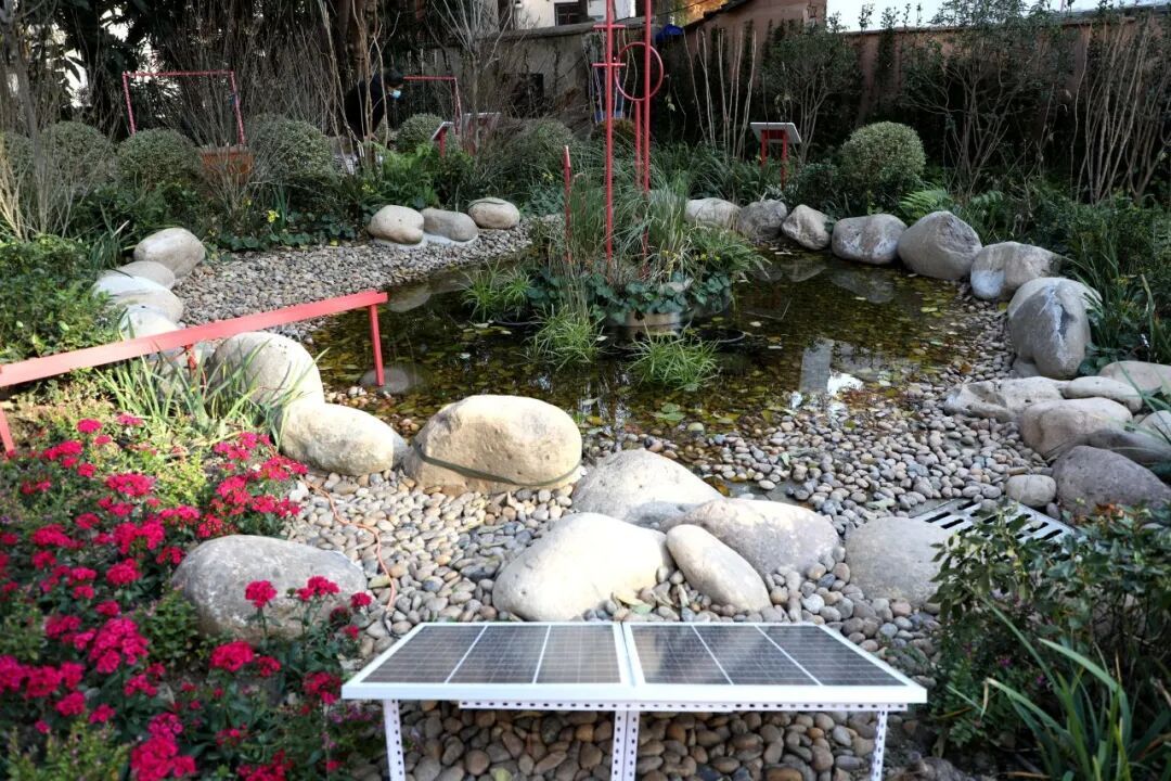 在花园的核心区域,迷你水池、旱溪湿地与木桩踏步构成了灵动的景观。潺潺水流顺着水渠流淌,让静谧的花园“活”了起来,清脆的水声为冬日增添了几分野趣。这里不仅是居民休憩赏景的好去处,还成为了小区里小动物“洗澡”“喝水”的天然驿站。