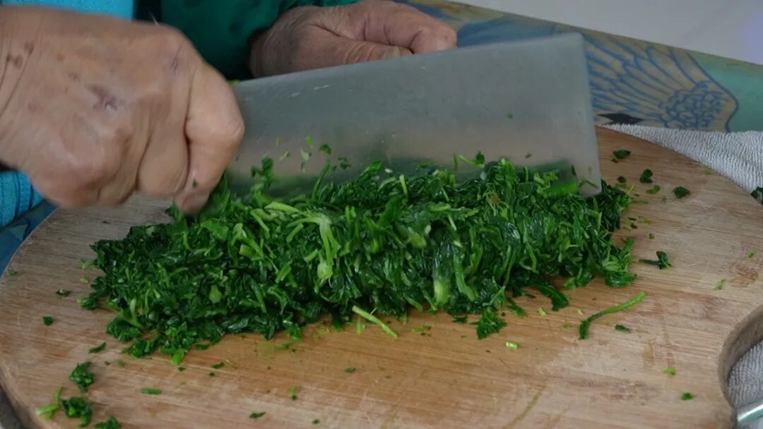 回到家,卢凤珠娴熟地处理起荠菜:先洗净焯水去除土腥气,切碎后拌入肉馅反复揉搓,待馅料粘稠。指尖翻飞间,一个个饱满的馄饨就整整齐齐码在了托盘上。