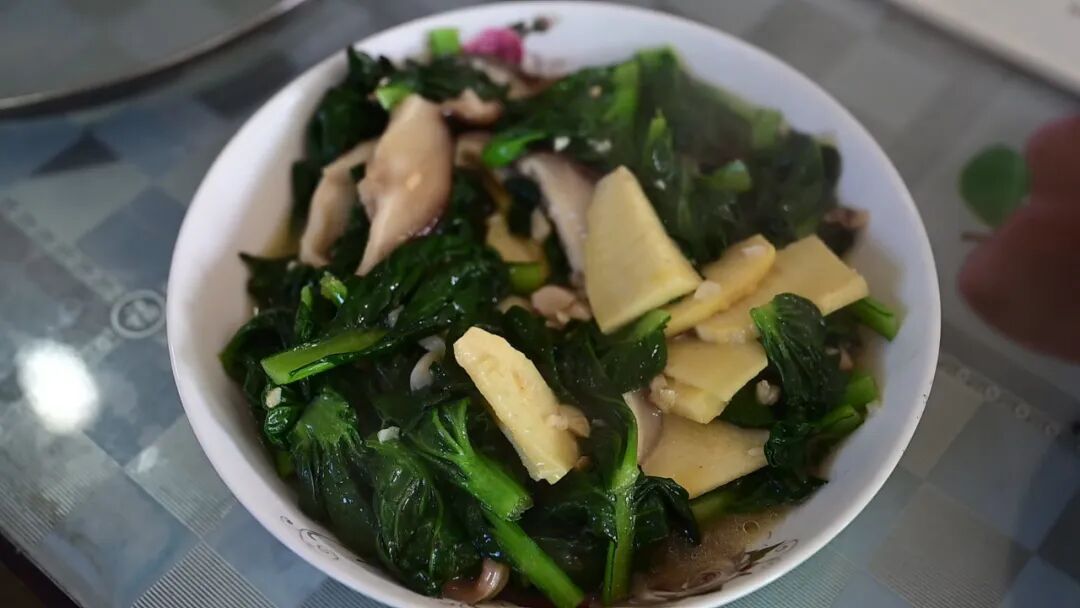 冬日餐桌上,塔菜也是当仁不让的主角。“霜打过的塔菜最甜,要选个儿小的,3棵就能炒一盘。”小庙村村民樊月芳从菜园回来便着手制作。去根洗净、在沸水中焯烫、过凉水、起锅烧油……一阵蒜末爆香后,樊月芳熟练地在锅中加入冬笋片、香菇片煸炒,再倒入塔菜猛火快炒,最后撒入盐、糖、味精调味。