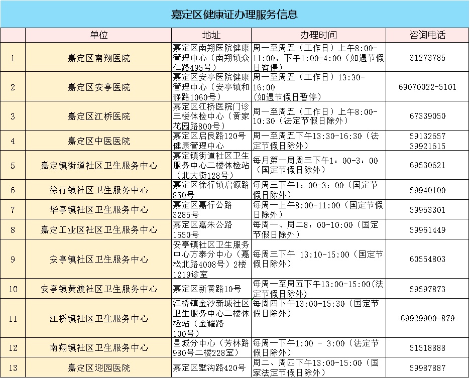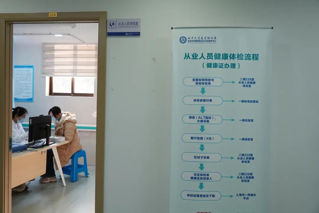目前,南翔镇社区卫生服务中心星城分中心每周一13:00—15:00提供从业人员健康体检服务,市民可提前线上预约。体检需携带本人身份证,检查项目包括抽血(ALT指标检测)、大便采集、胸片(X 光)、肛拭子采集。完成检查后5—7个工作日,市民可通过上海一网通办平台查询、打印健康证。
