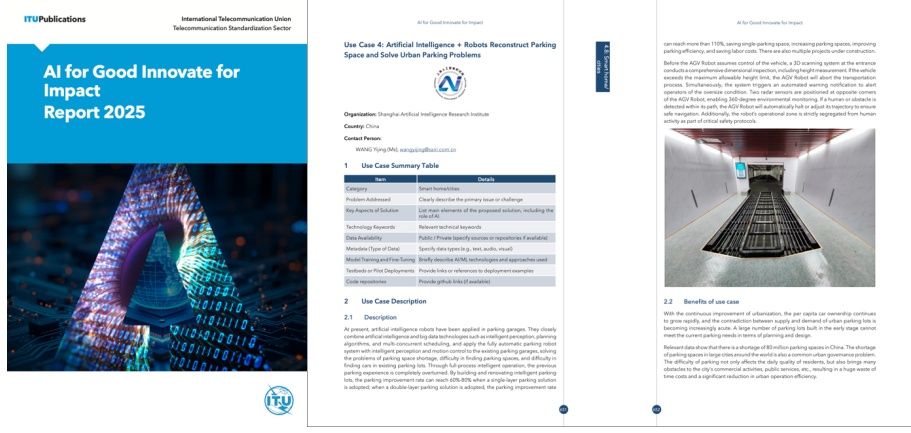 近日,联合国国际电信联盟(ITU)在“人工智能向善”全球峰会期间正式发布《人工智能向善:创新扩大影响案例集》,由全球工业人工智能联盟卓越中心组织推荐、闵行企业上元立交(上海)科技有限公司(以下简称“上元立交”)研发的“智能停车机器人”应用案例成功入选,成为该案例集中“智慧城市”领域全球仅有的11家入选企业之一,标志着中国智能停车技术创新获得全球权威认可。