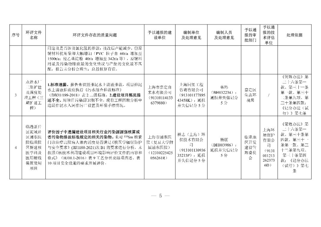 复核过程中发现4份建设项目环境影响报告书(表)存在标准使用错误/遗漏、环境影响因素分析不全、建设项目概况描述不全、污染源源强核算内容不全/错误等编制质量问题。根据《管理办法》第二十六条第一款、第三十条第四款、第三十一条第一款、第三十二条第九项以及《建设项目环境影响报告书(表)编制单位和编制人员失信行为记分办法(试行)》(以下简称《记分办法(试行)》)第七条规定,我局决定对4家环评文件编制单位、5名编制人员予以通报,并分别失信记分5分;对4家建设单位、3家审批部门、1家技术评估单位予以通报(具体情况详见附件)。