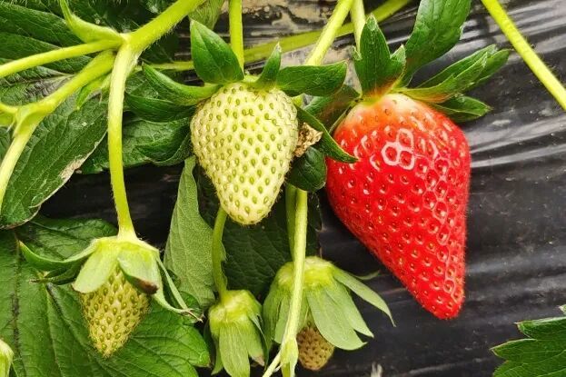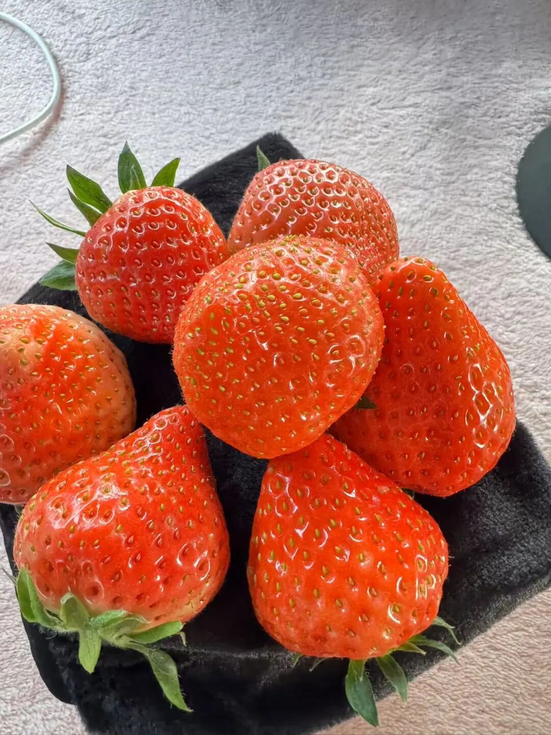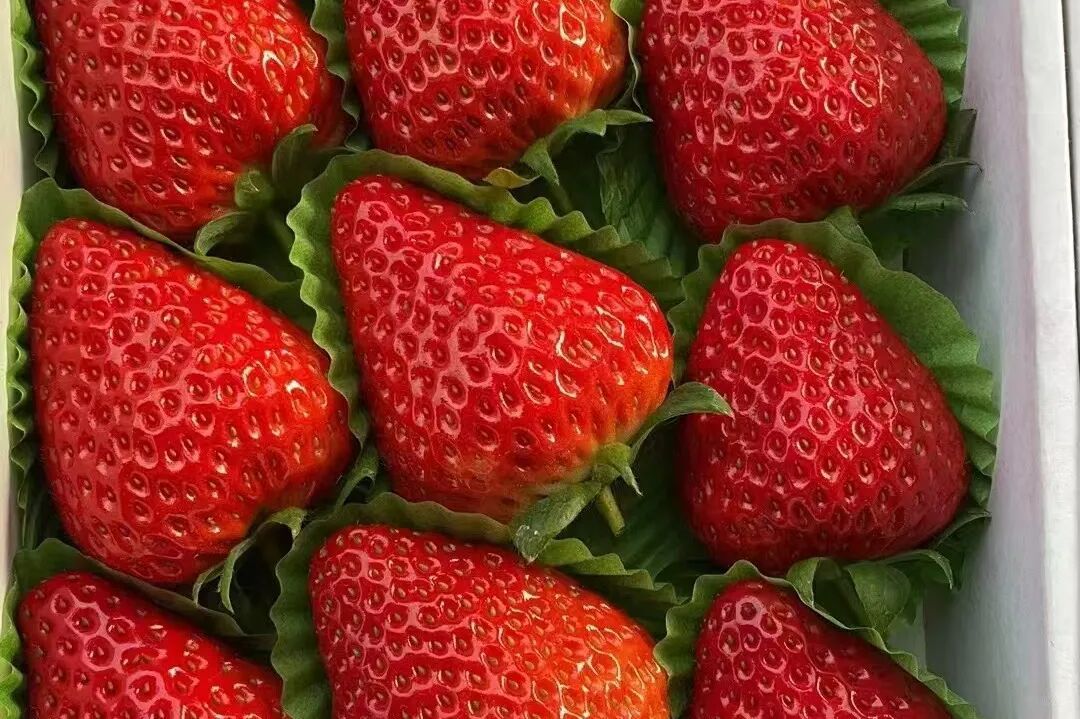 看颜色:选果身均匀泛红、果蒂处带点浅绿的,避免全青或局部发黑的,白鹤草莓因光照均匀,红度普遍更统一;