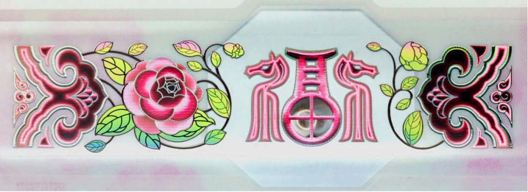 位于票面下方。改变观察角度,票面正面可见“如意云纹”、“山茶花”与“福”字组成的装饰纹样呈现多色动感特征。“福”字下部“田”字内可见立体动感高亮圆环效果。防伪特征效果见图6。