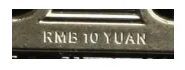 在硬币正面面额数字“10”的底端,可观察到“RMB 10 YUAN”的微缩文字。防伪特征效果见图4。