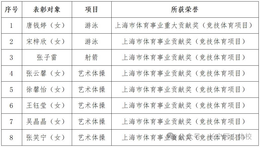 据上海市体育局、上海市人社局印发的《上海市体育局上海市人力资源和社会保障局关于表彰在全运会上作出突出贡献的上海运动员教练员和有关人员的决定》,对在全运会上为上海争得荣誉的运动员、教练员授予“上海市体育事业重大贡献奖”和“上海市体育事业贡献奖”,其中共有10名长宁健儿受到表彰。