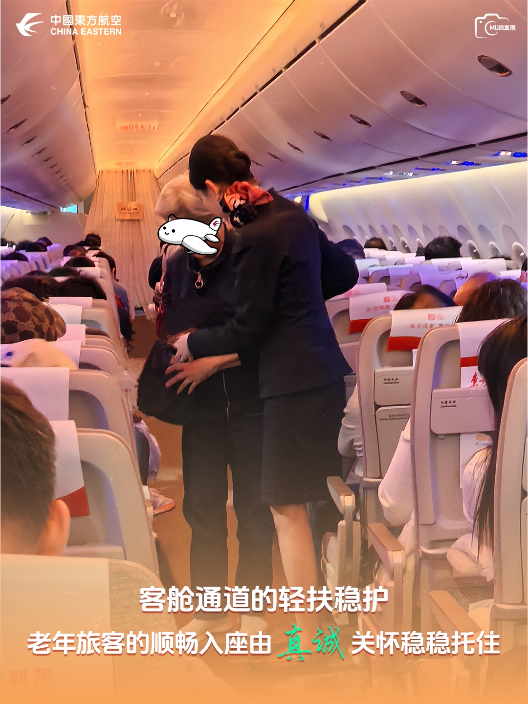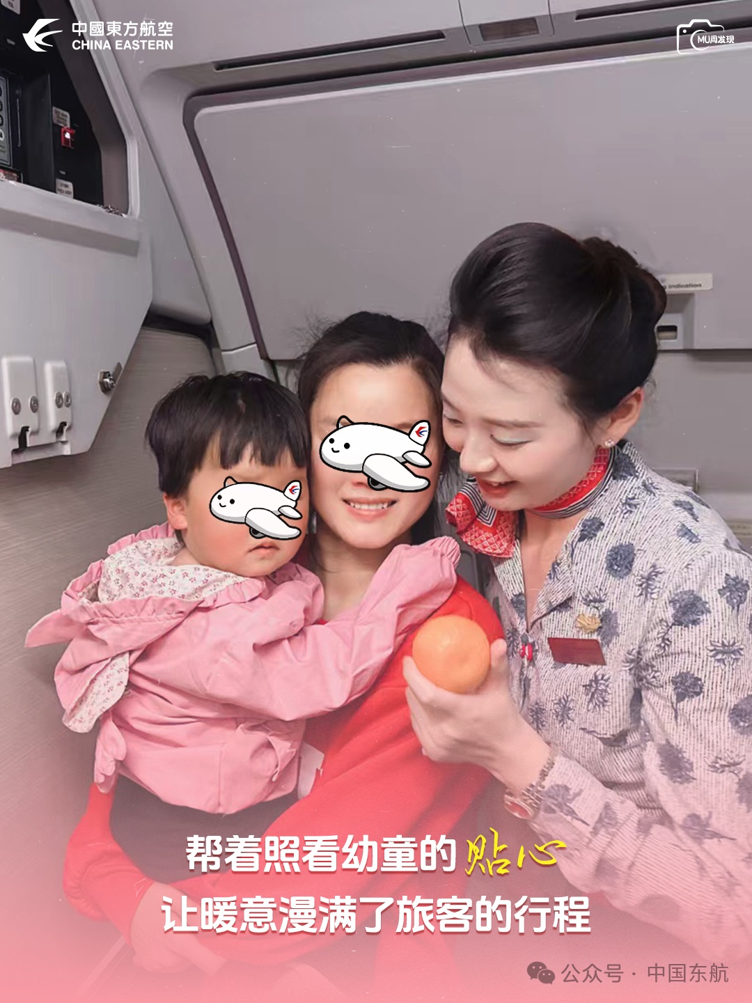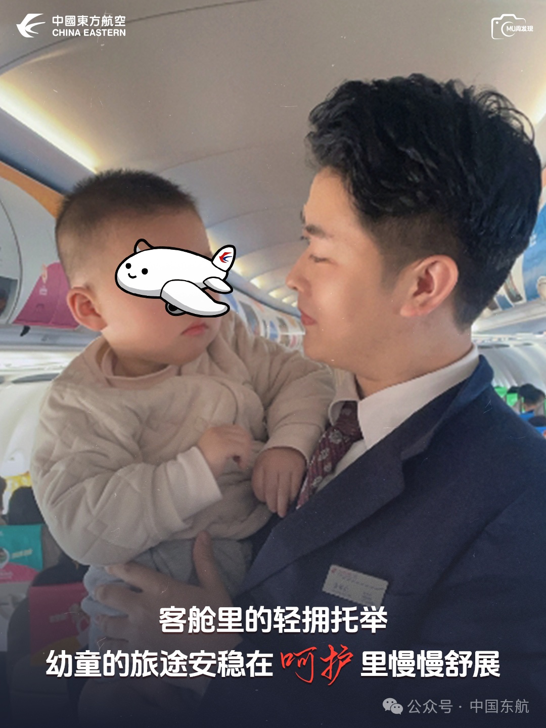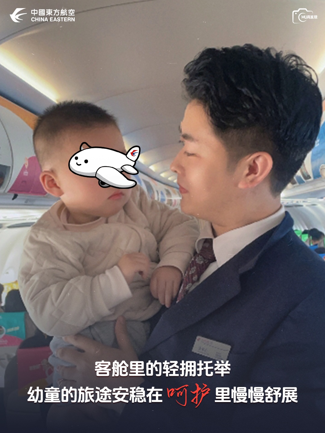 【客舱角落,乘务员轻托住带娃家长怀里的幼童,帮着整理随身物品,掌心的暖意,让带娃出行的局促悄悄化开。这份轻托,是东航服务里的温柔具象——客舱部】