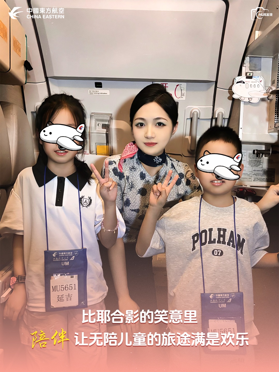 【客舱里,乘务员蹲身和无陪儿童比耶合影,把专属无陪包挂在孩子胸前,笑意里的温柔,让独自出行的旅途满是安心。这份陪伴,是东航人藏在细节里的真诚——客舱部】