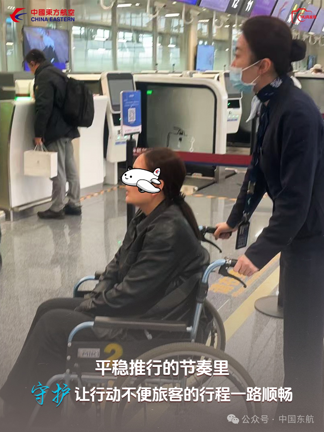 【候机楼里,地服员稳稳推行轮椅,一路轻缓避开人群,把行动不便的旅客平稳送到登机口。每一步的细致,都是东航人对特殊旅客的用心守护——西北分公司】