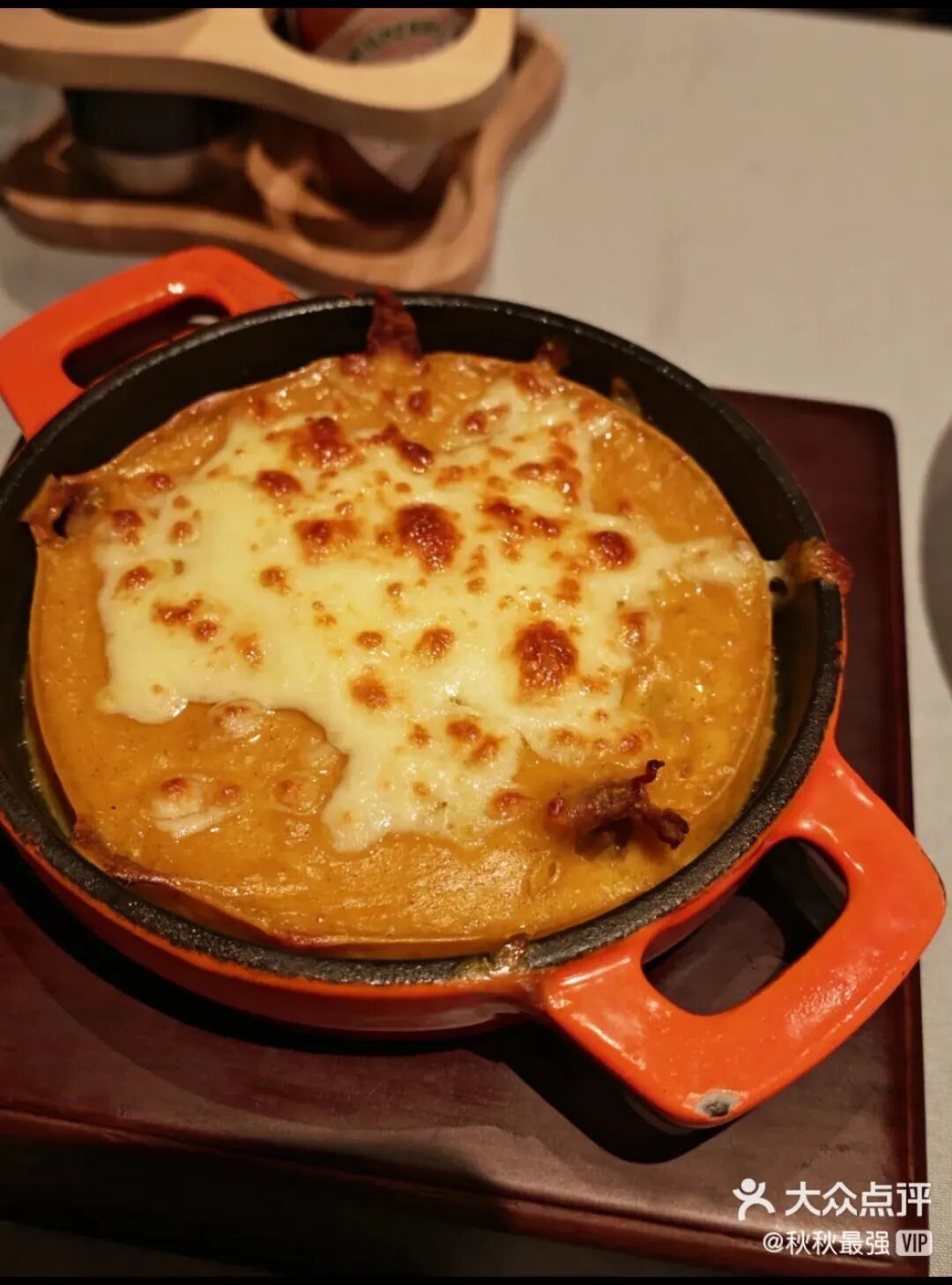 “葡国鸡”看似简单其实需要多道工序。将炒锅打开,将腌制好的鸡肉入锅,两面煎黄后,用富有鸡香味儿的底油烹炒蔬菜。将炒好的蔬菜放入一口“定制”的、小小的橙红色珐琅锅中,铺底。再将两面煎黄的鸡肉铺在蔬菜上方。第三层则是用椰浆、淡奶油和少许姜黄粉进行调味,制成明黄色的复合酱汁,将酱汁浇在前两层的食材上,浓浓锁住层层食材。第四层则是铺满马苏里拉芝士。