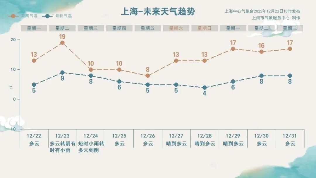 今日(12月22日)申城天气以多云为主,偏东风3~4级,沿江沿海地区4~5级,相对湿度80%~40%,空气较为干燥。气温方面,晨间气温较低,大部分郊区最低气温在-1~4℃,徐家汇站最低气温5.4℃,全天气温在5~13℃。