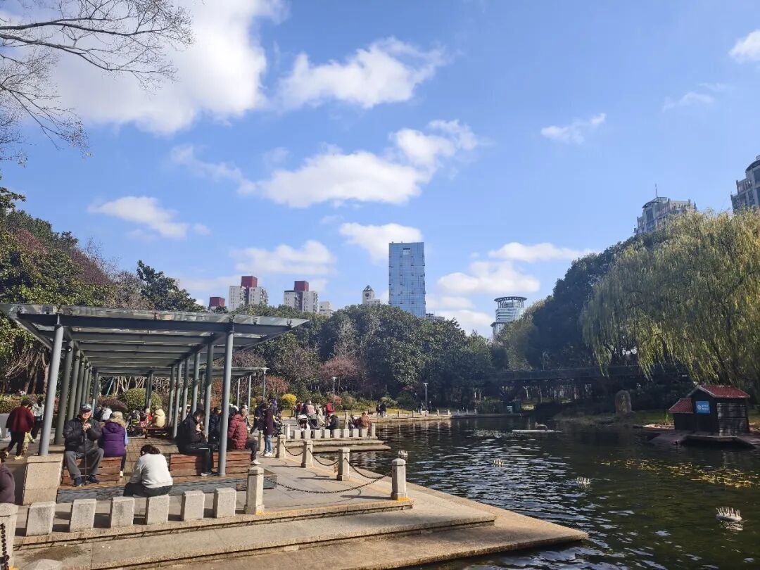 上午十点,徐家汇公园内,游客们或在林荫步道悠然散步,或在长椅上休憩,热爱歌唱的阿姨爷叔们相聚树下奏乐合唱。汇金湖畔人气十足,市民们围坐在湖边长亭,享受闲适的时光。