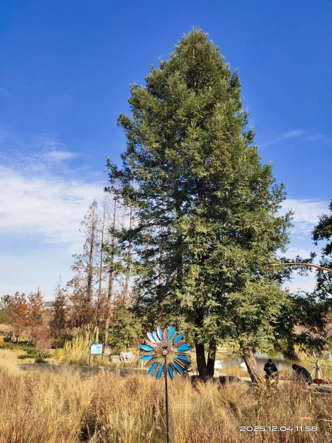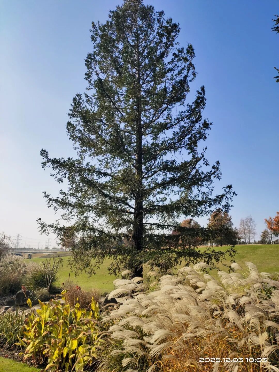 与同区域水杉相比,北美红杉的优势格外突出:冠形优美、枝叶繁茂,更难得的是四季常绿,即便寒冬也不改苍翠本色。当周围乔灌木褪去绿叶、草本植物染上枯黄,红杉的墨绿枝叶便形成强烈视觉反差,伟岸树姿倒映在水面,成为绿地中自带流量的网红打卡点。
