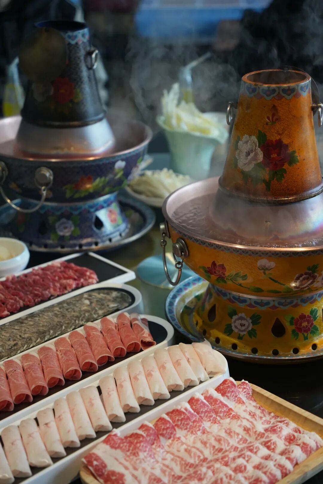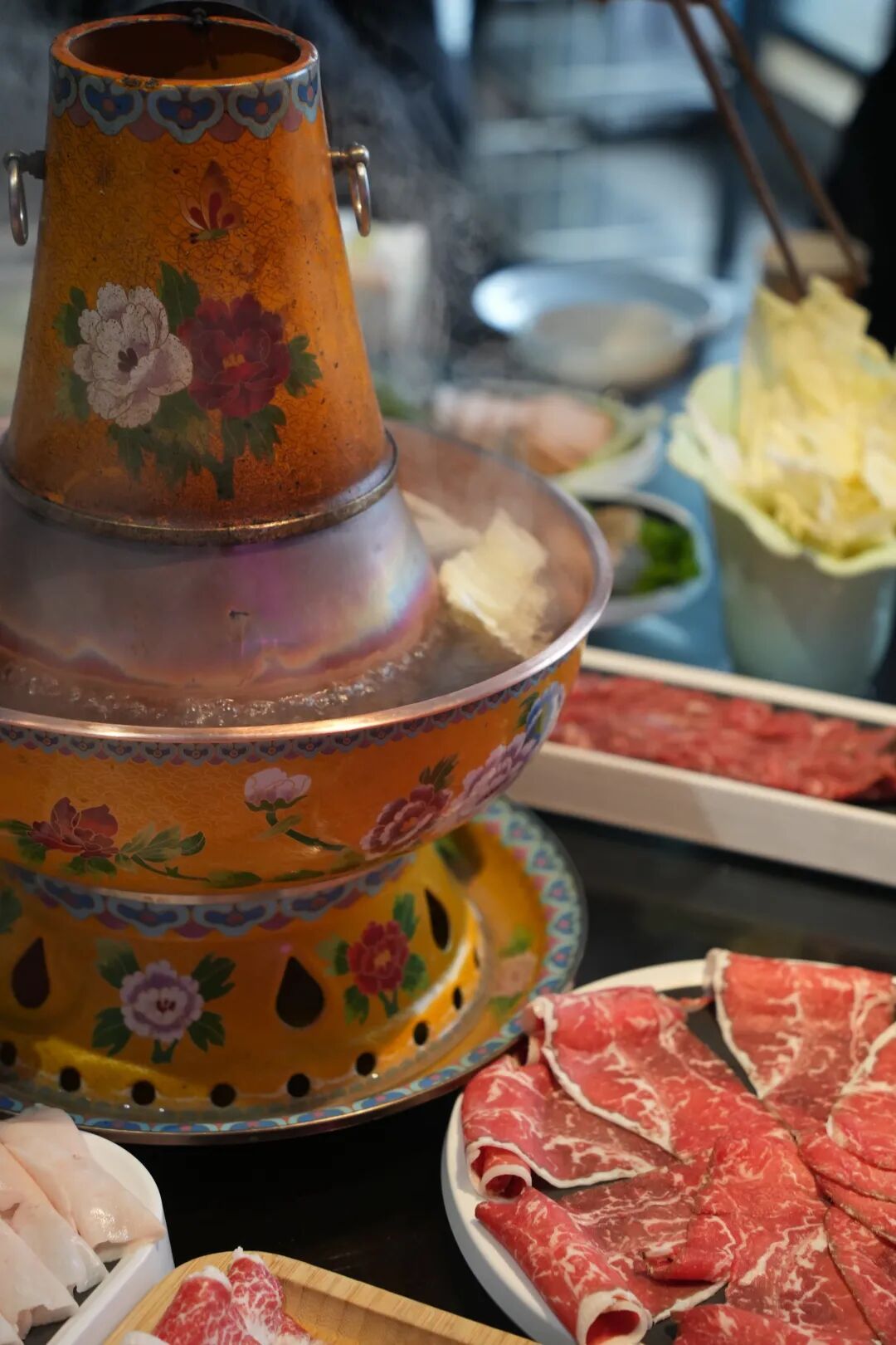 深夜十一点,推开“蹦牙”的玻璃门,景泰蓝铜锅的咕嘟声如背景音般持续着,每张方桌中央都放着这样一口锅,炭火在炉膛里静燃,清汤翻滚着枸杞与红枣。水汽蒸腾上天花板,在灯光下形成朦胧光晕。