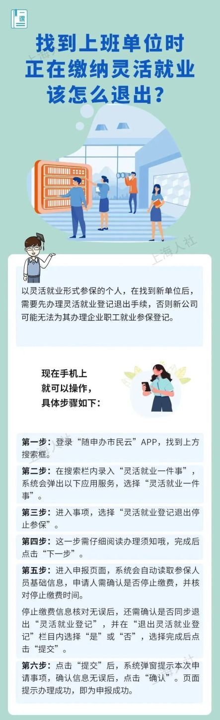 小英最近收到了一家心仪公司的offer,企业HR通知她说,下周就要为她办理入职手续,并提醒她,如果她在以灵活就业参保的话,要尽快办理退出手续,否则可能影响她后续单位为她缴社保。像这样找到上班单位后,灵活就业参保该怎么退出?