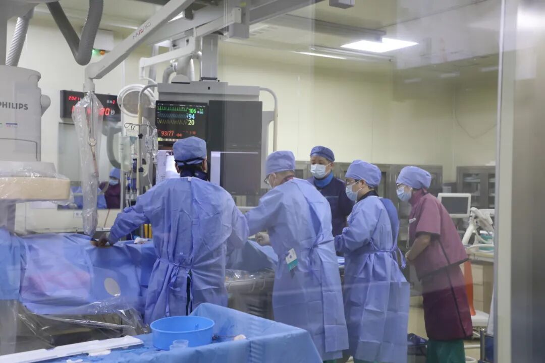 救护车抵达后,心内科主任王志华带领团队第一时间接手。冠状动脉造影显示,患者心脏最重要的三根血管均存在严重狭窄与堵塞,其中左前降支堵塞严重,生命悬于一线。团队紧急实施了经皮腔内冠状动脉成形术(PTCA)及前降支支架植入术,并对回旋支远端实施血管扩张治疗。手术顺利,患者术后恢复良好,目前已出院,待心脏康复后再择期完成眼科手术。