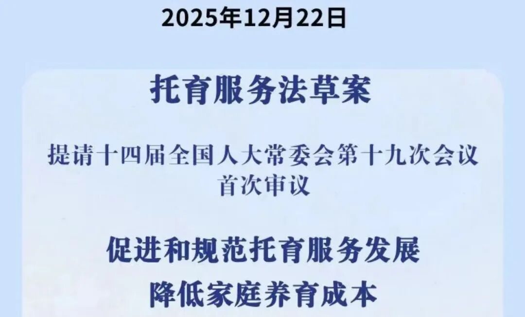 12月22日,托育服务法草案提请十四届全国人大常委会第十九次会议首次审议。