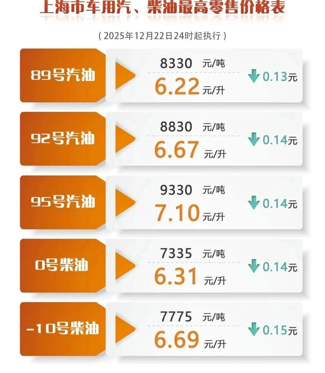 自今天(12月23日)零时起,92号汽油将下调为6.67元/升,95号汽油下调为7.10元/升,0号柴油下调为6.31元/升。降幅为0.13-0.15元/升。