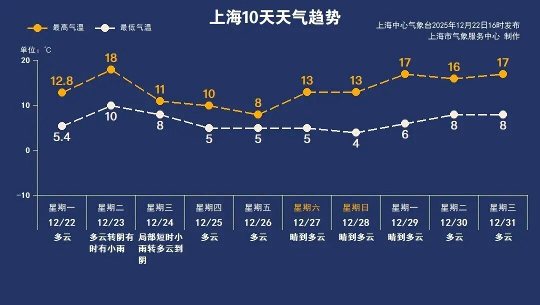 【冷空气即将到达】随着冷空气前锋横扫而过,明天(12月24日)气温降至8-11℃之间。周四周五气温继续下降,全天气温在10℃以内。双休日以晴或多云天气为主,但回暖有限,这波冷空气还是有可能将申城带入冬天。