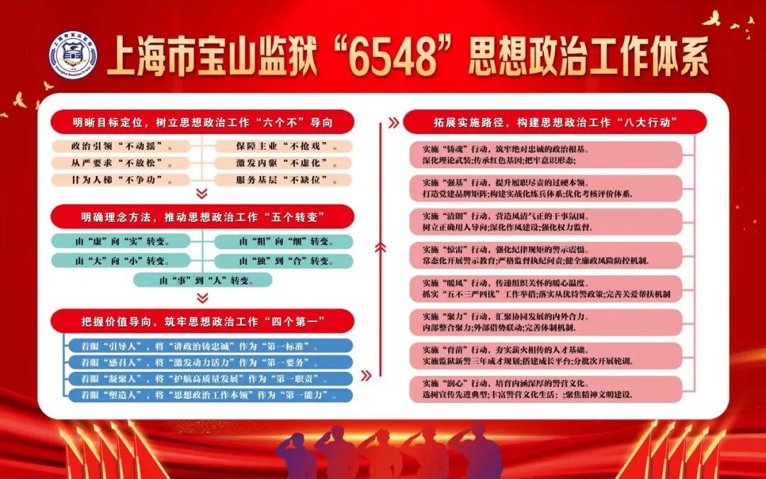 《中国共产党思想政治工作条例》印发后,宝山监狱迅速响应,认真落实上级党委关于加强和改进思想政治工作的决策部署,以《条例》为根本遵循,细化落实市监狱管理局党委印发的《关于进一步加强基层党组织思想政治工作的实施意见》,以分众化、对象化、精准化为着力点,系统谋划"6548"思想政治工作体系,为监狱工作高质量发展提供强大动力。