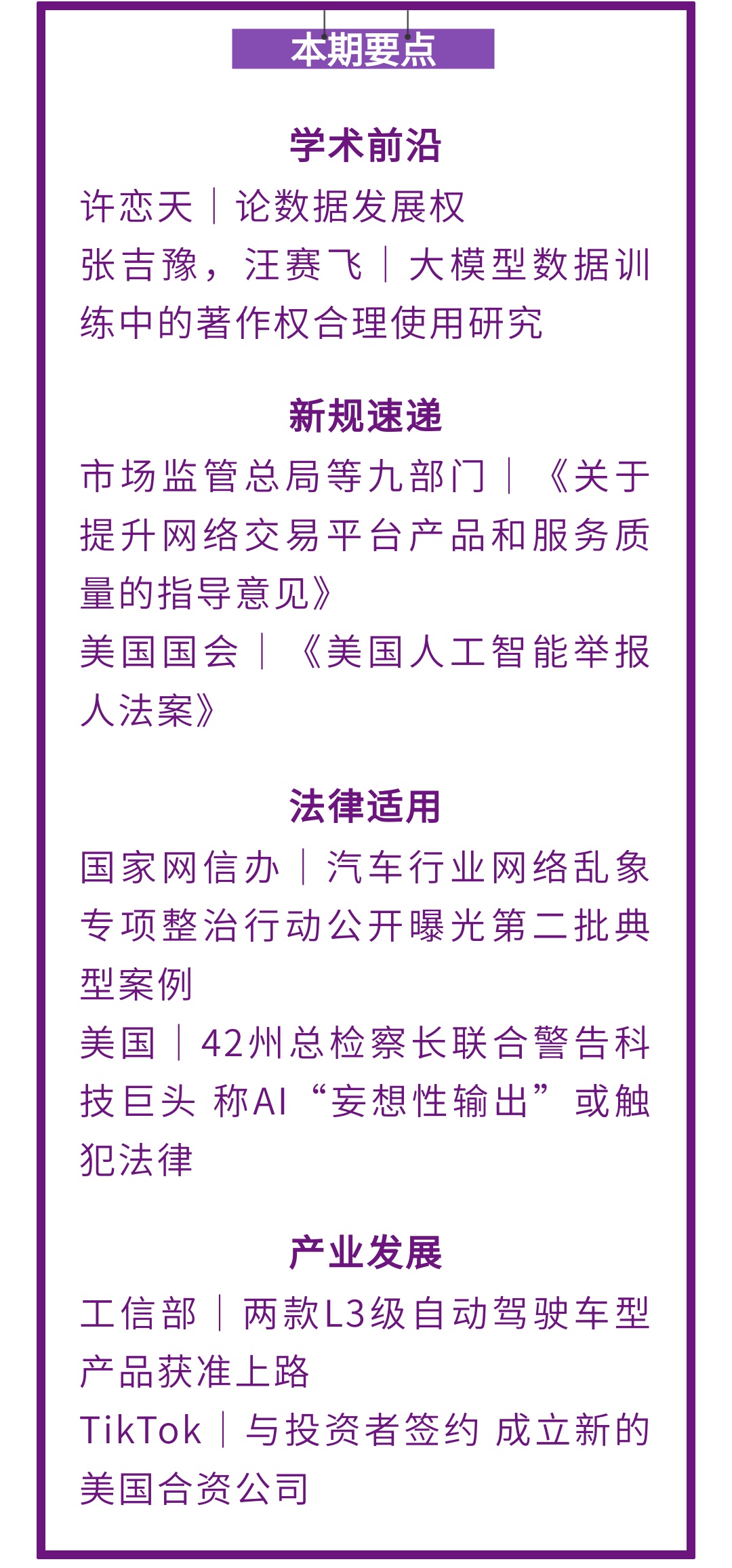 美国|得克萨斯州总检察长以限制令禁止海信非法收集用户数据2025年12月20日消息。得克萨斯州总检察长近日成功获得一项临时限制令,针对电子产品制造商海信(Hisense)涉嫌非法收集用户个人信息的行为采取法律行动。该命令旨在立即阻止海信继续其未经授权的数据收集行为。根据总检察长办公室提交的指控,海信在其智能电视中使用的自动内容识别技术,在未明确获得消费者知情同意的情况下,秘密捕获了用户家中的声音及图像等敏感信息。调查进一步指出,海信将这些非法收集的个人数据用于出售牟利。此次获得的临时限制令,在法律诉讼进行期间,将立即禁止海信继续通过其技术收集、使用、出售或分享任何通过ACR技术获取的用户数据。(DataGuidance)12月15日,工信部公示,长安汽车和北汽蓝谷麦格纳提交了搭载L3级有条件自动驾驶功能的智能网联汽车产品准入申请,根据《道路机动车辆生产企业及产品准入管理办法》等有关规定,经受理、审查、公示等程序,工信部附条件许可长安牌SC7000AAARBEV型纯电动轿车、极狐牌BJ7001A61NBEV型纯电动轿车在限定区域开展自动驾驶上路通行试点。(工业和信息化部)